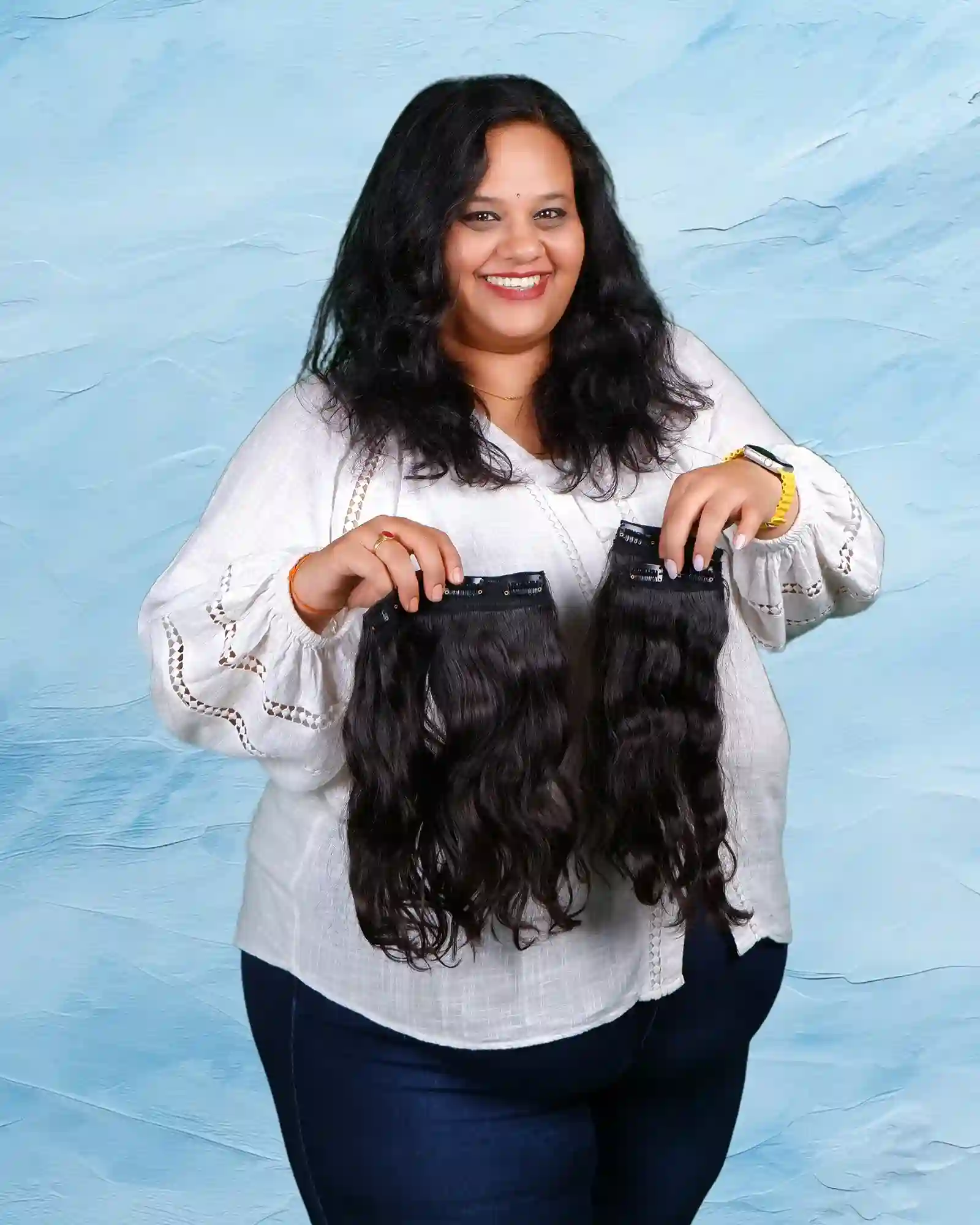 Our set of 3 wavy clip-in extensions are great to instantly boost your overall hair volume in just under 2 mins!! Comes in a set of 3 extensoions.2 side patches & 1 medium extension that can be clipped in at the back of your head.